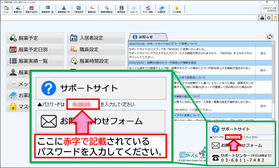 されます。服やっくんのメニュー画面で最新のパスワードを確認してください。