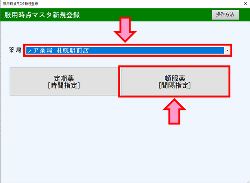 3.薬局名を指定し、頓服薬[間隔指定]を選択します。