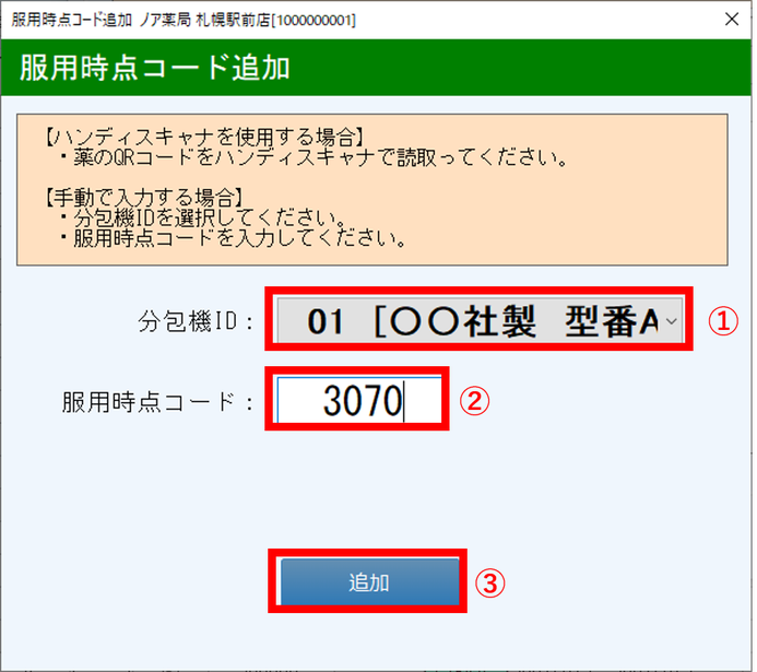 6-B.服用時点コード追加の画面が表示されるので、①分包機を選択し ②服用時点コードを手入力します。