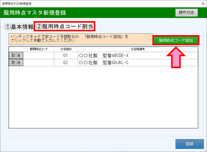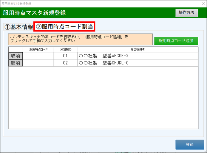6‐A.お薬のQRコードを読み込むと、服用時点コードが自動で入力されます。「登録」を選択します。