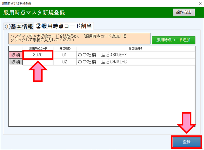 7-B.入力した服用時点コードが表示されているのを確認のうえ、「登録」を選択します。